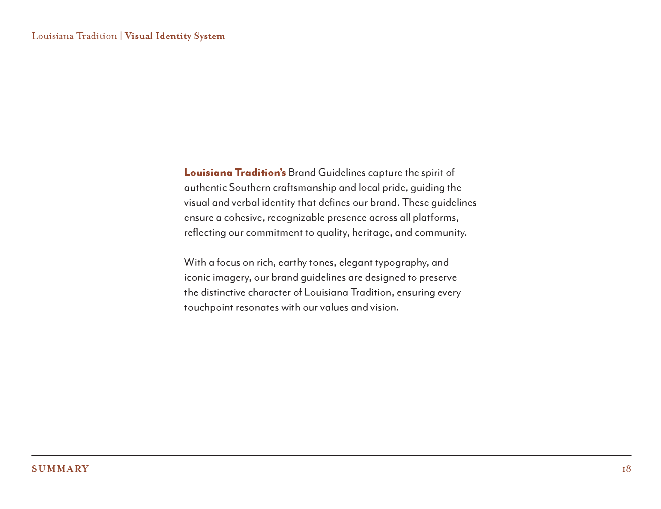 Louisiana Tradition – Brand Guidelines is a comprehensive and carefully considered collection of standards that define and protect the visual identity of the rebrand. This guide serves as a foundational tool, outlining how to consistently apply every element of the brand, from logo usage and color palette to typography, layout systems, and imagery treatment for marketing materials. It ensures that the brand’s essence remains clear, cohesive, and recognizable across all platforms.