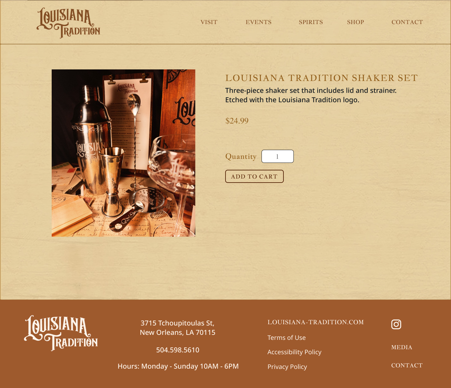To bring the Louisiana Tradition rebrand together, I designed a user-friendly website that serves as a central hub for the entire identity. The site was created to showcase each element of the rebrand, from spirit labels and packaging to custom glassware, menus, and advertisements. All while highlighting the story and cultural inspiration behind the project. My focus was on clean navigation, engaging visuals, and an intuitive layout that allows visitors to easily explore the brand and experience its heritage in a modern, accessible way.