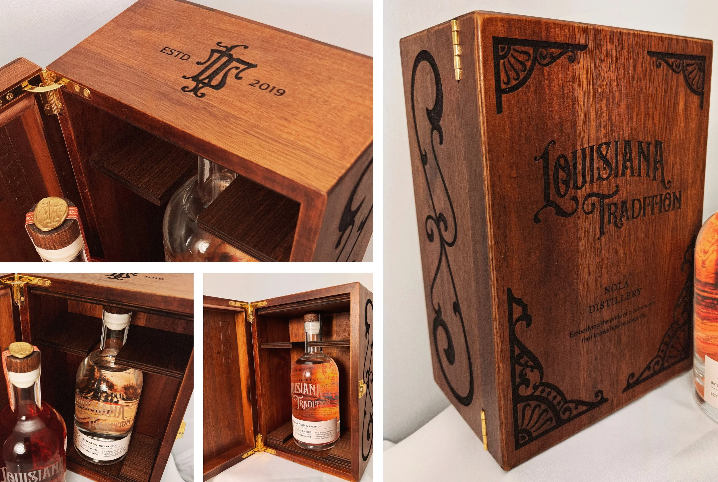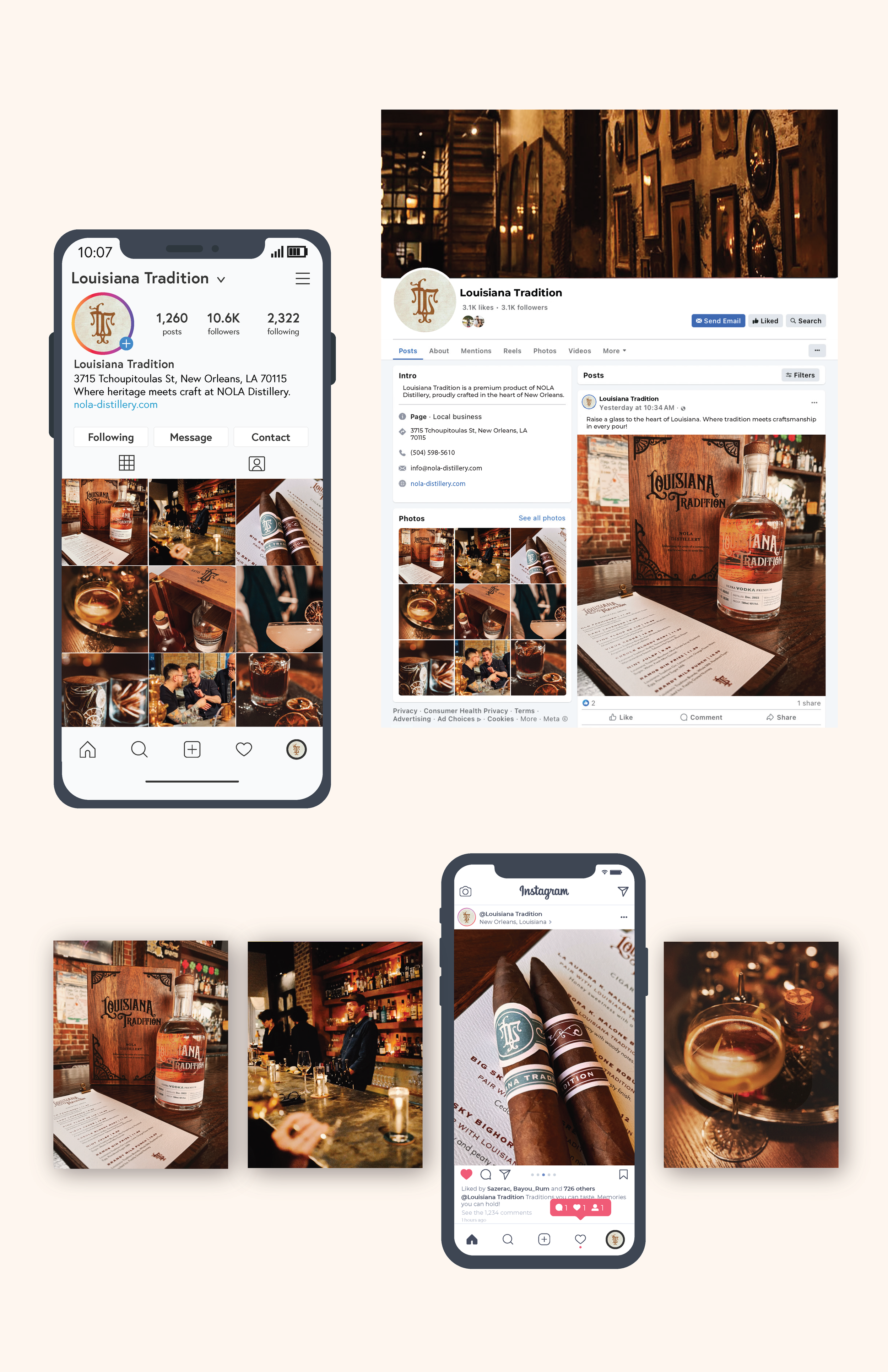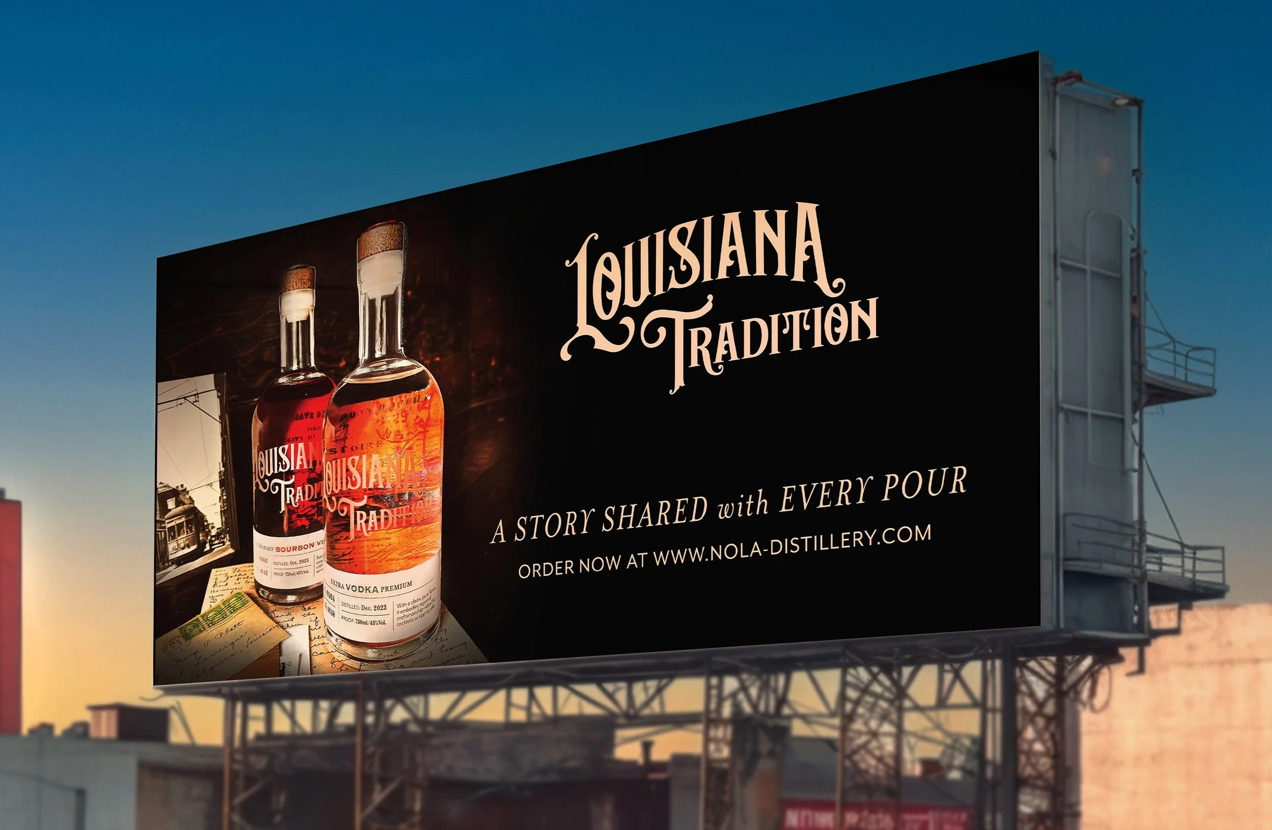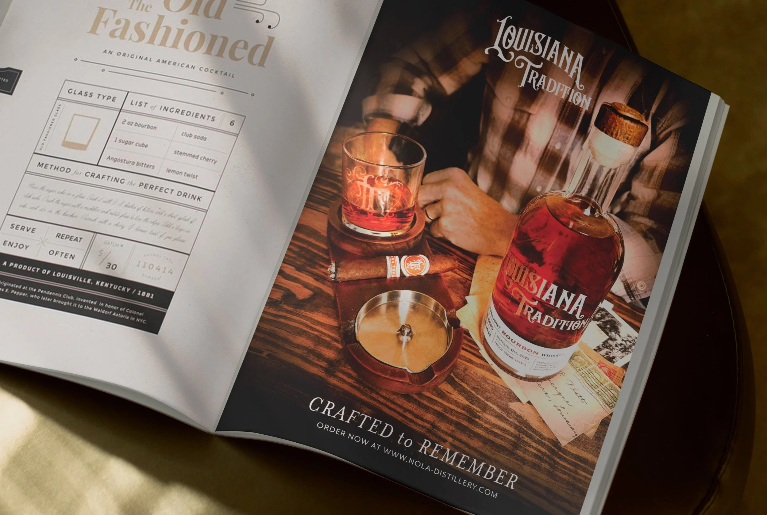 The rebrand included new label designs for the Louisiana Tradition Brandy, Gin, Bourbon, and Vodka, each carefully developed to reflect both individuality and cohesion within the larger product line. Beyond packaging, I expanded the identity through custom glassware for each spirit, cigar wraps, menus with wooden backings, a user-friendly website layout, and a suite of print and digital advertisements. Together, these components formed a comprehensive system designed to immerse customers in the story of Louisiana Tradition while presenting a polished, contemporary brand presence. This project was not only a creative challenge but also a personal journey. By merging my own roots in South Louisiana with the principles of design, I was able to honor the culture I care deeply about while demonstrating the power of branding as a tool for storytelling, community connection, and cultural preservation.